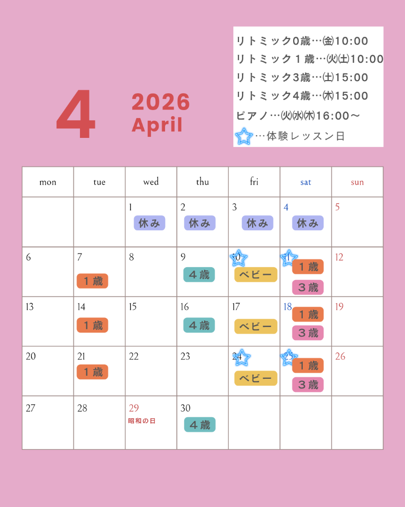 | 2歳クラス 2023.4〜2024.3 | 3/7・28(土)11:00-12:00 残1組 |