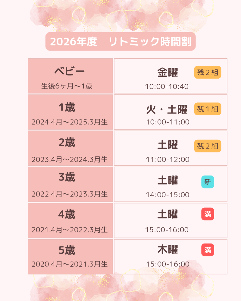 | 2歳クラス 2023.4〜2024.3 | 4/11・25(土)11:00-12:00 残1組 |